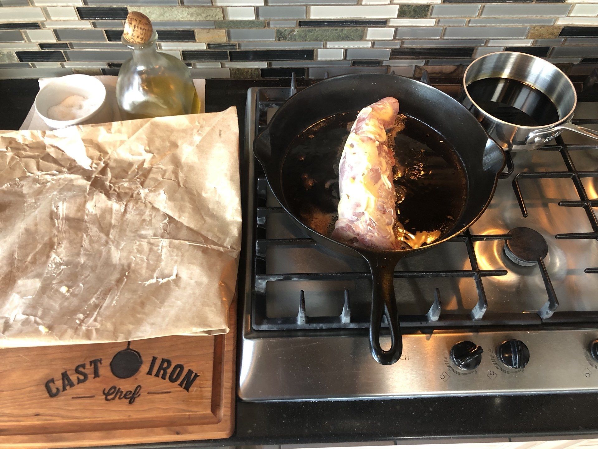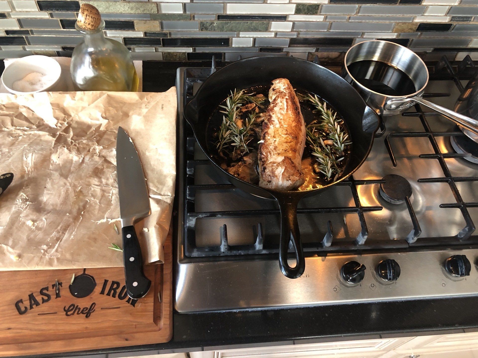 Place pork into a large cast iron skillet along with marinade. Bake in the oven, basting occasionally, for 1 hour or until the pork reaches an internal temperature of 145˚. Remove the pork loin from the oven, place it on a cutting board and let it rest for 5-10 minutes. Pour juices into a fat separator. Slice and serve the pork loin with marinade drizzled over the top.