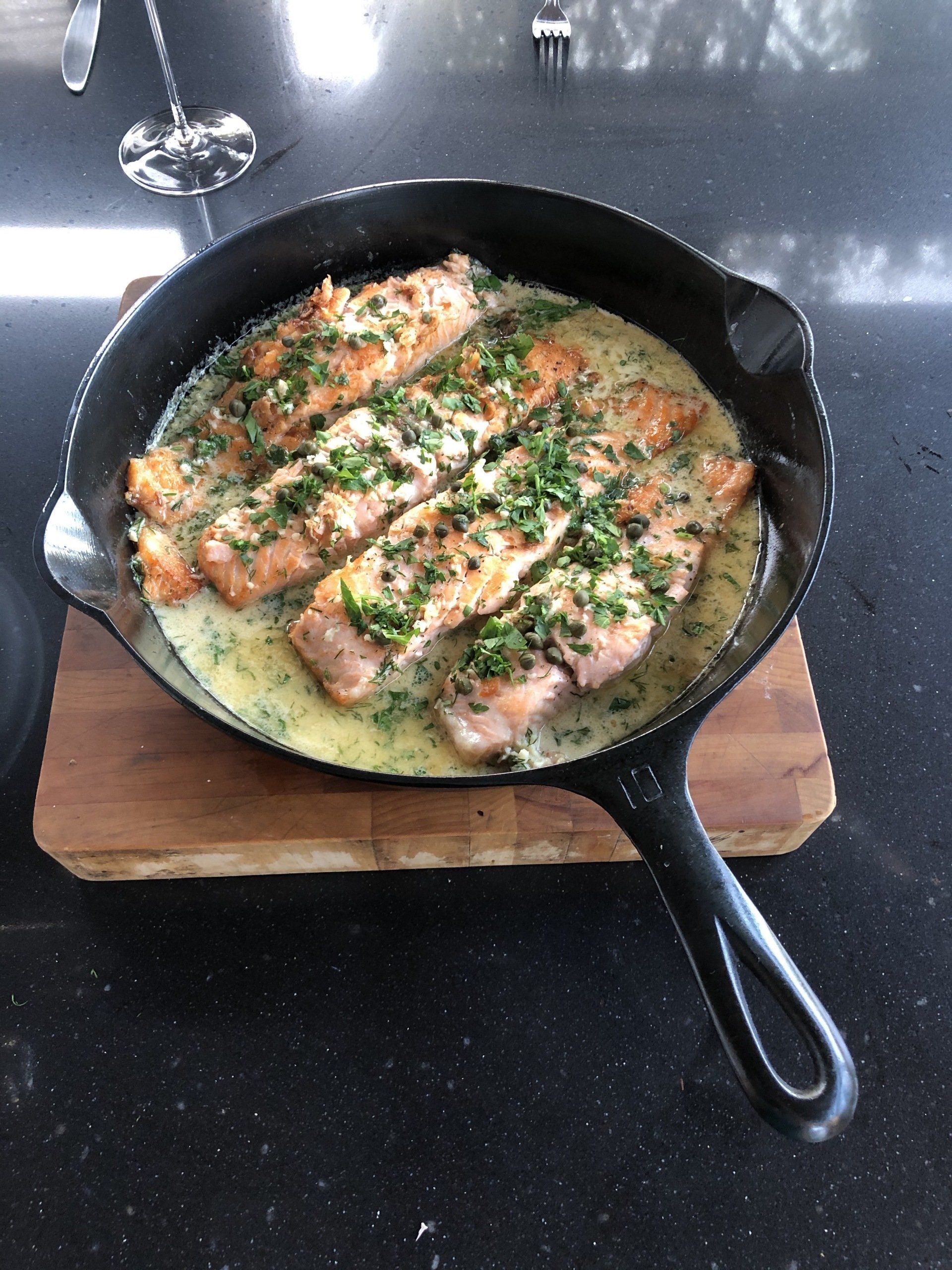When the sauce becomes thick and creamy, return salmon to the skillet and add capers. Serve with sauce spooned over the salmon.