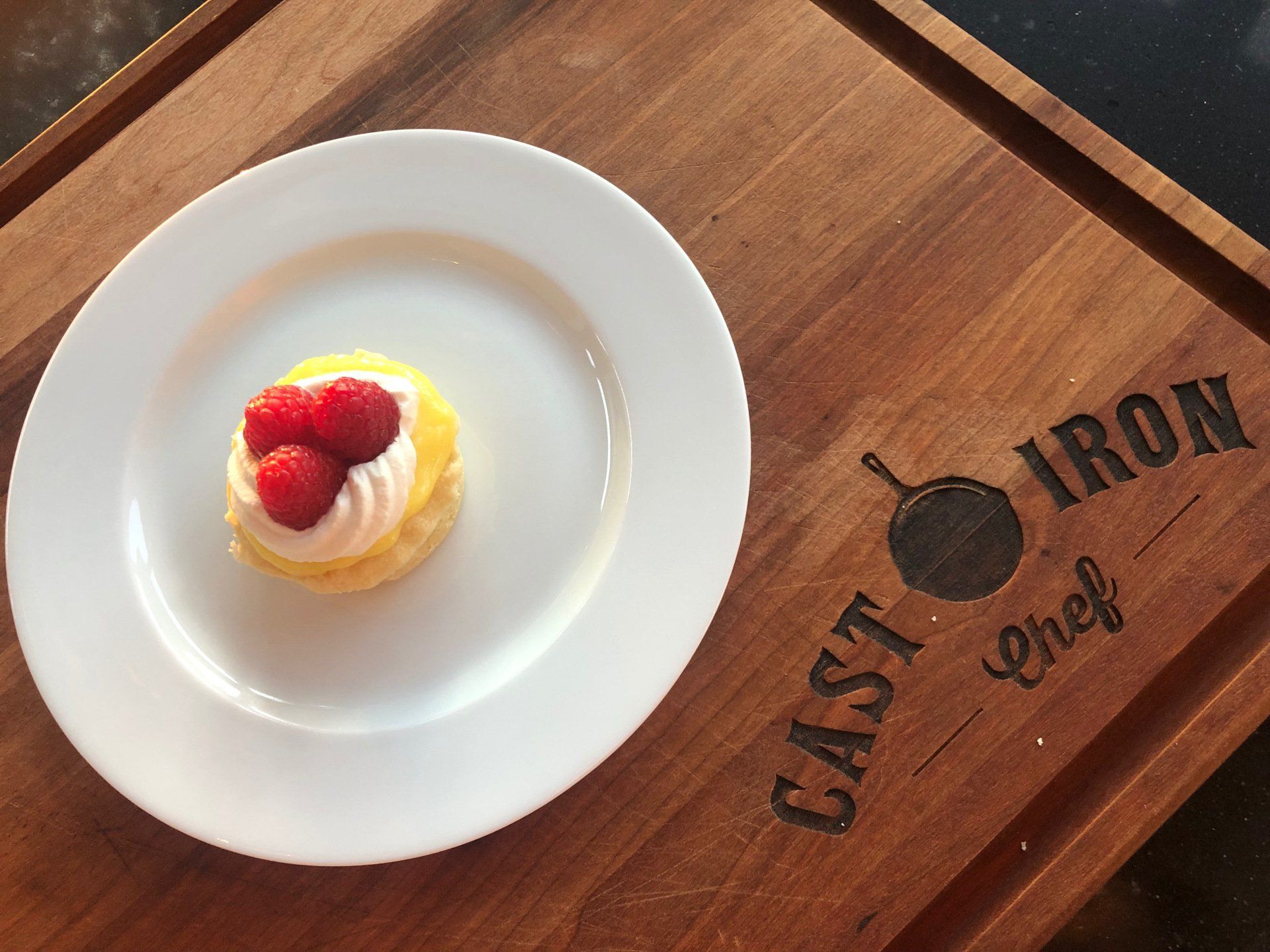 Fill each cup with lemon curd. Top with whipped cream and raspberries.