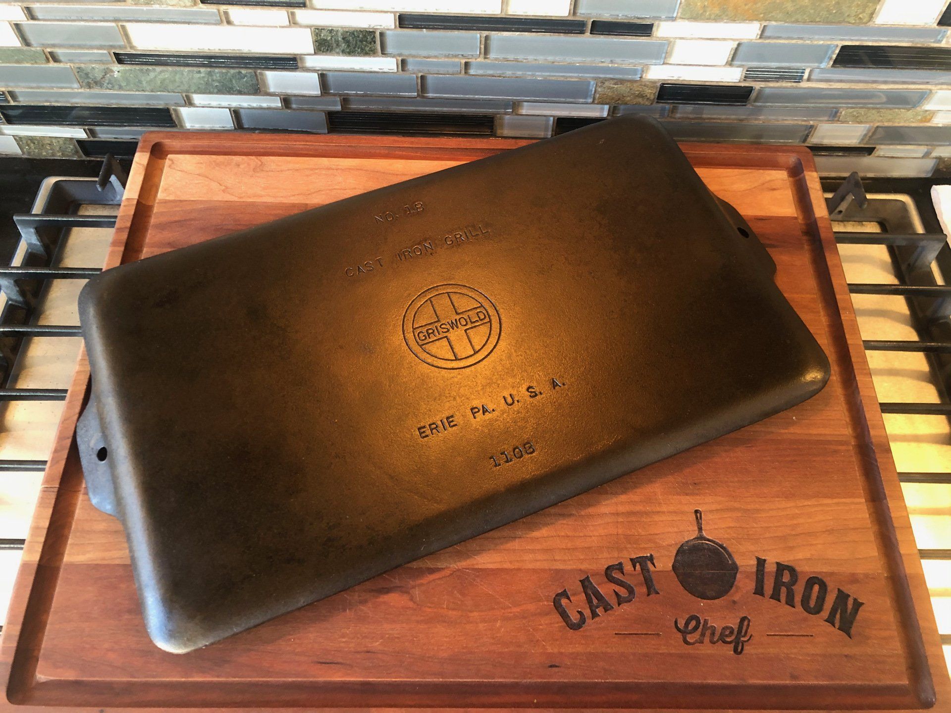 I picked this up the same time I found my Griswold loaf pan. I'm in the process of stripping and re-seasoning it. I'm hoping it makes cookies that are crunchy on the bottom and soft on the inside. Yum. We'll see. Stay tuned!