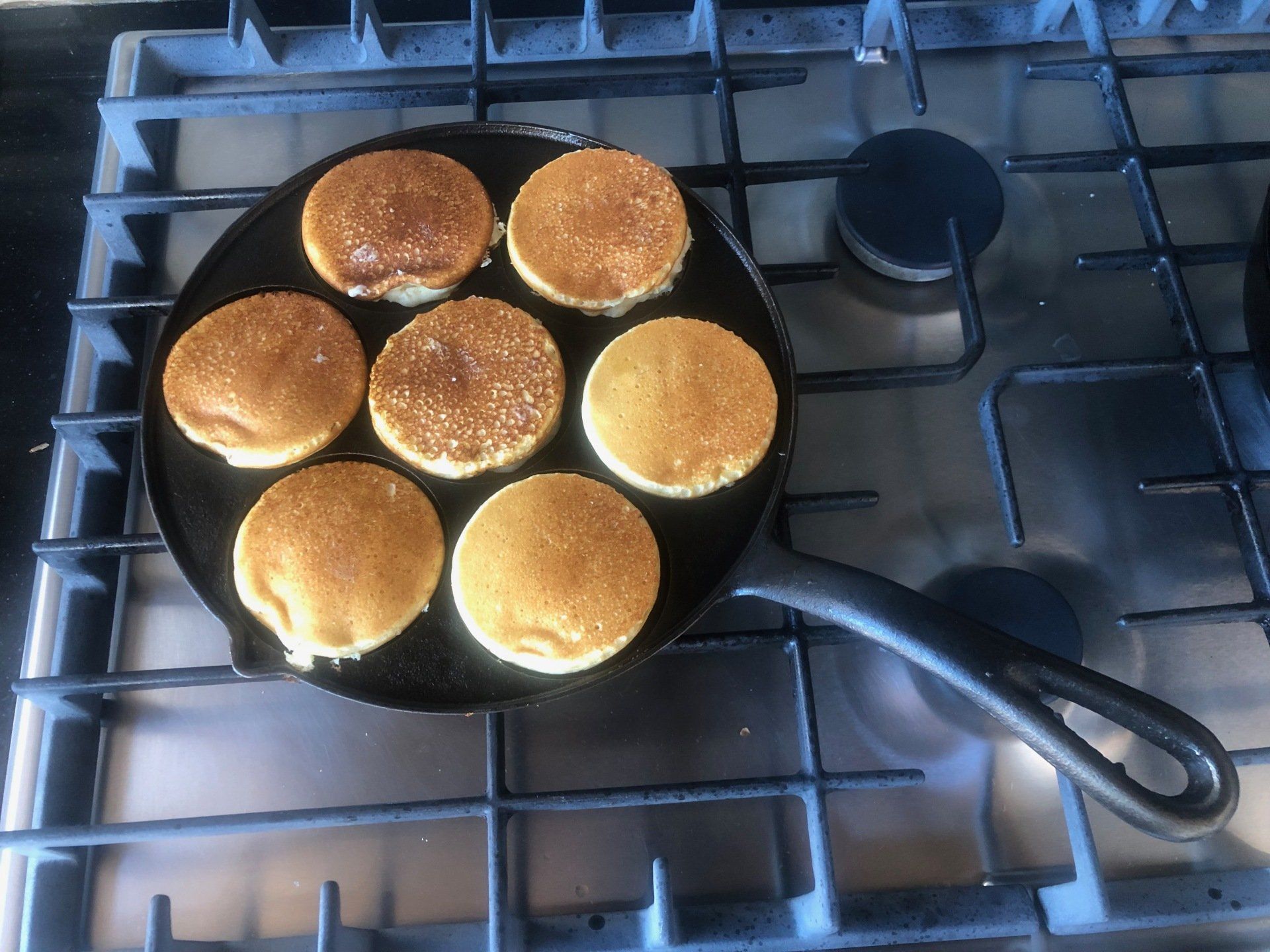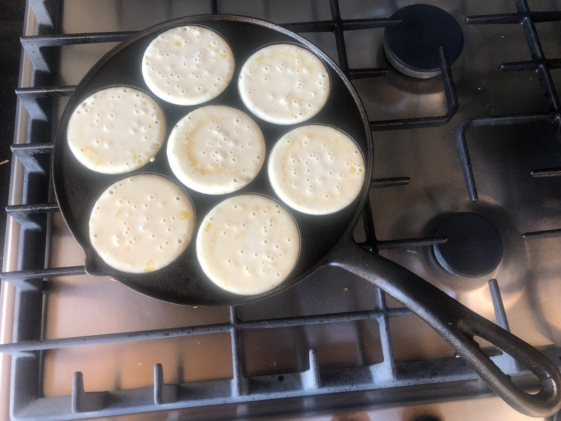 Melt a little bit of butter in each plett cup. Ladle the batter onto the griddle (approx. ¼ cup per pancake) and cook for about 3 minutes per side, or until the pletts puff up with bubbles, become golden brown, and are just cooked through.