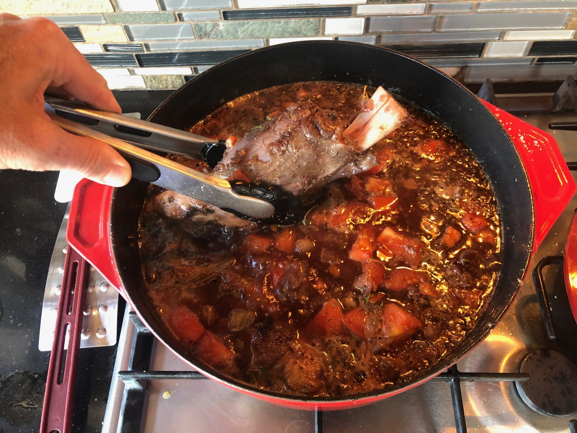 Reduce heat to low, cover and cook until the meat is very tender and falling off the bone—about 2 to 2 ½ hours