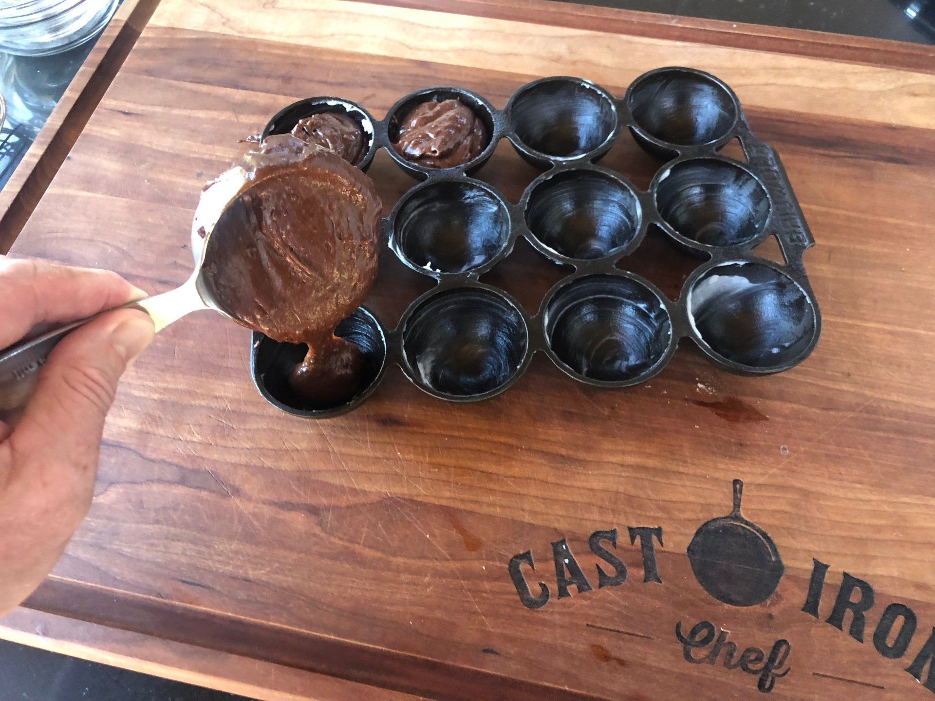 Warm the salted caramel sauce. Pour it evenly over the brownie batter. Using the spatula, swirl in the caramel to create a marbling effect in the batter. Using a spoon, scoop the batter into the muffin pan, filling almost all the way full.