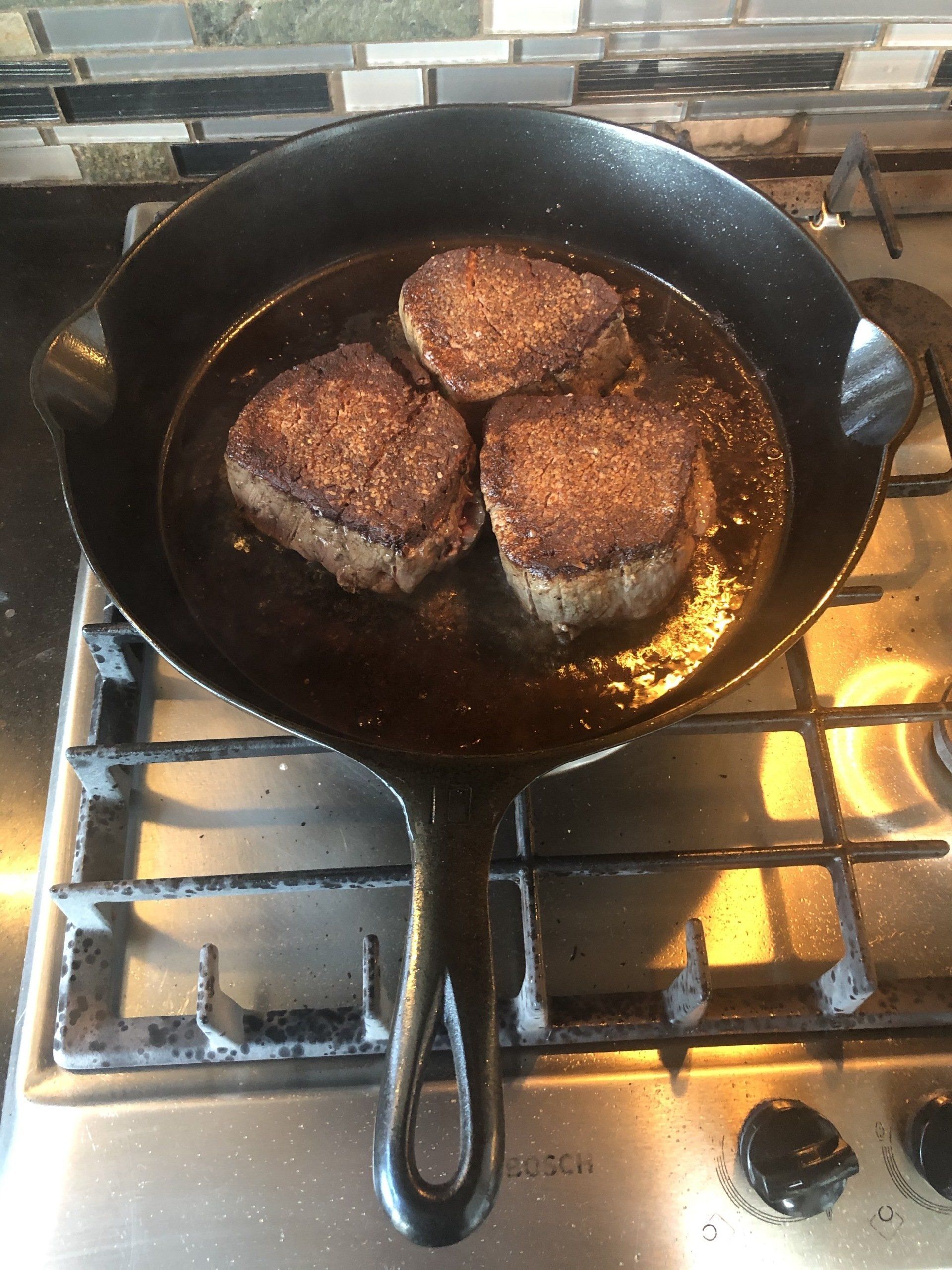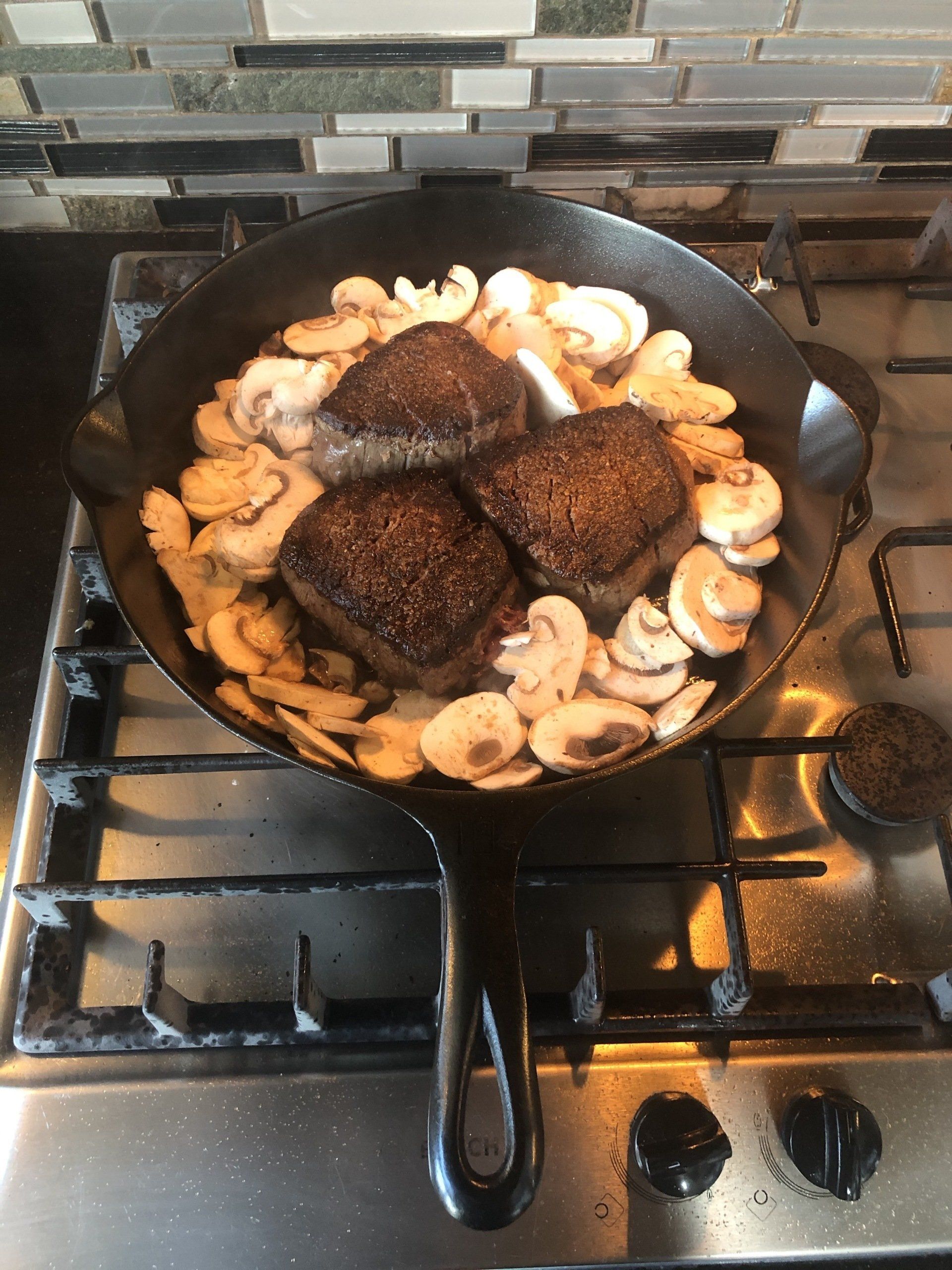 When Katie and I have an evening alone, this is the dinner I make. I’ve changed it quite a bit over the years. The truffle oil adds an earthy flavor to the filet mignons. Add to it the brandy and mushroom pan sauce, and I’d say this is the best dish I know how to cook. Perfect for a stay-at-home date night.