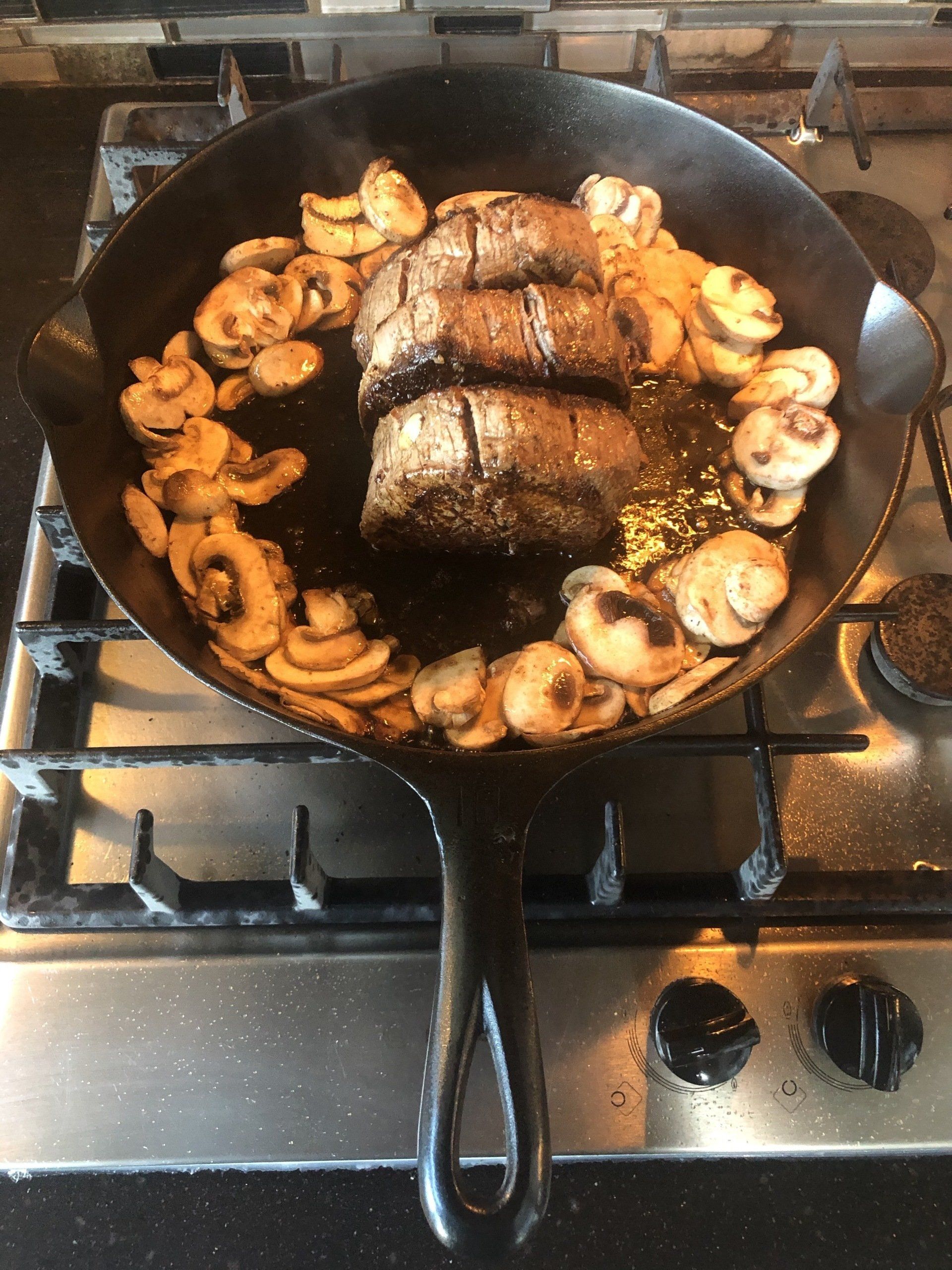 Pour 1 tablespoon of truffle oil into a 10-12” skillet. Add 2 tablespoons of butter and heat over medium high until the butter almost smokes. Place the steaks in the pan and lower the heat to medium. Sauté the steaks for 4 minutes on 1 side and then for 3 minutes on the other side, for medium rare. Remove the steaks to a serving platter and cover tightly with aluminum foil. Add the mushrooms and cook for 5 minutes.