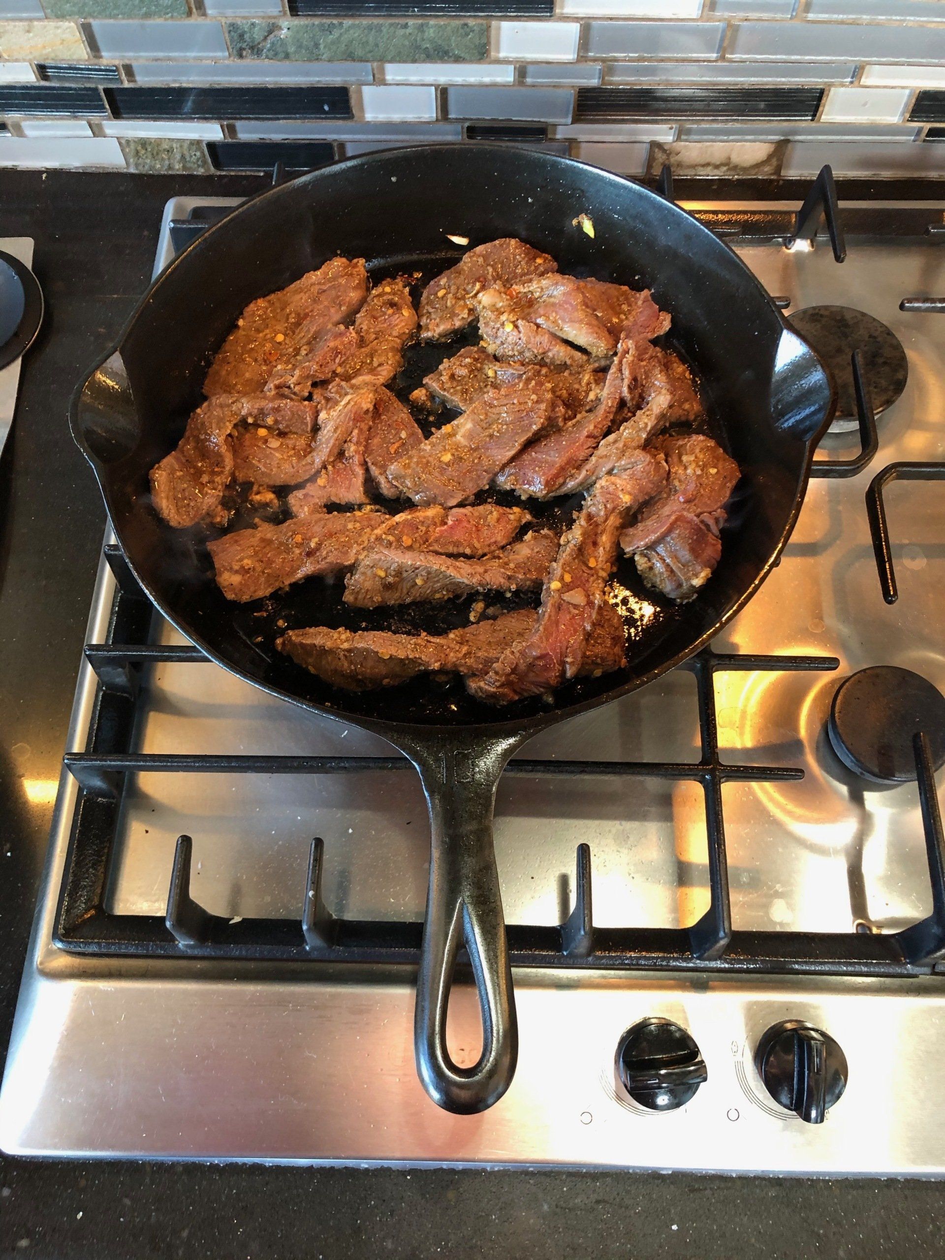 Add beef to the skillet. Saute for 3-4 minutes or until the strips lose their red color.