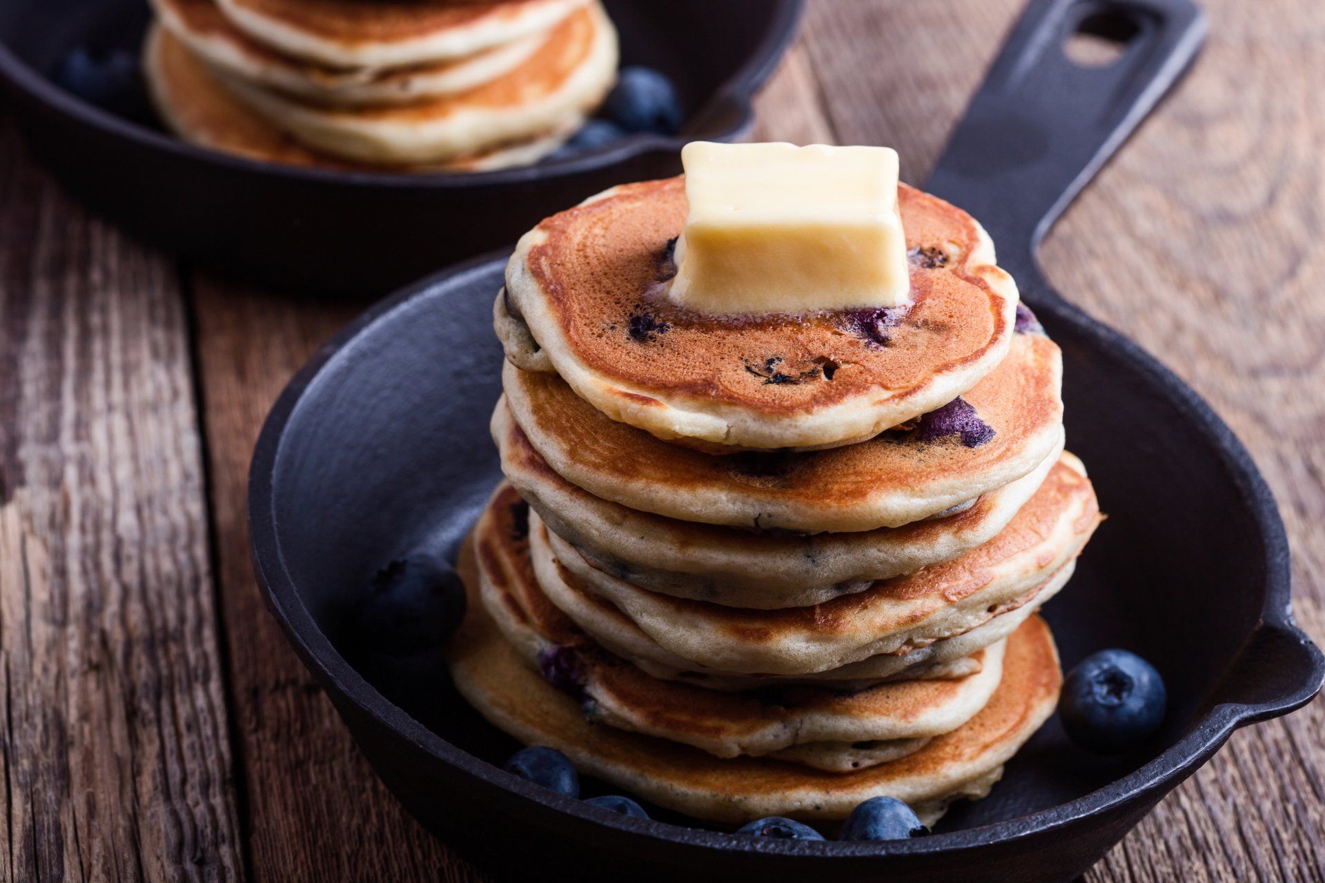 Melt some butter on the griddle. Ladle the batter onto the griddle and cook for about 3 minutes. Lightly press a few blueberries into each pancake. Flip the pancakes and cook for another 3 minutes or until the pancakes puff, become golden brown, and are just cooked through.