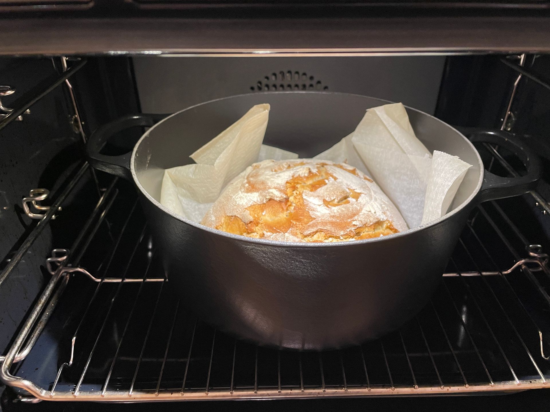 Remove the preheated large Dutch oven from the oven. Lift dough by the edges of the parchment paper and carefully place it on the bottom of the Dutch oven. Put the lid on and place the Dutch oven into the oven on the center rack. Reduce the temperature to 485° F (250° C) and bake for 18 minutes. Remove the lid, and reduce the oven temperature to 465 F (240° C) and bake for an additional 25 minutes or until deep, golden brown.