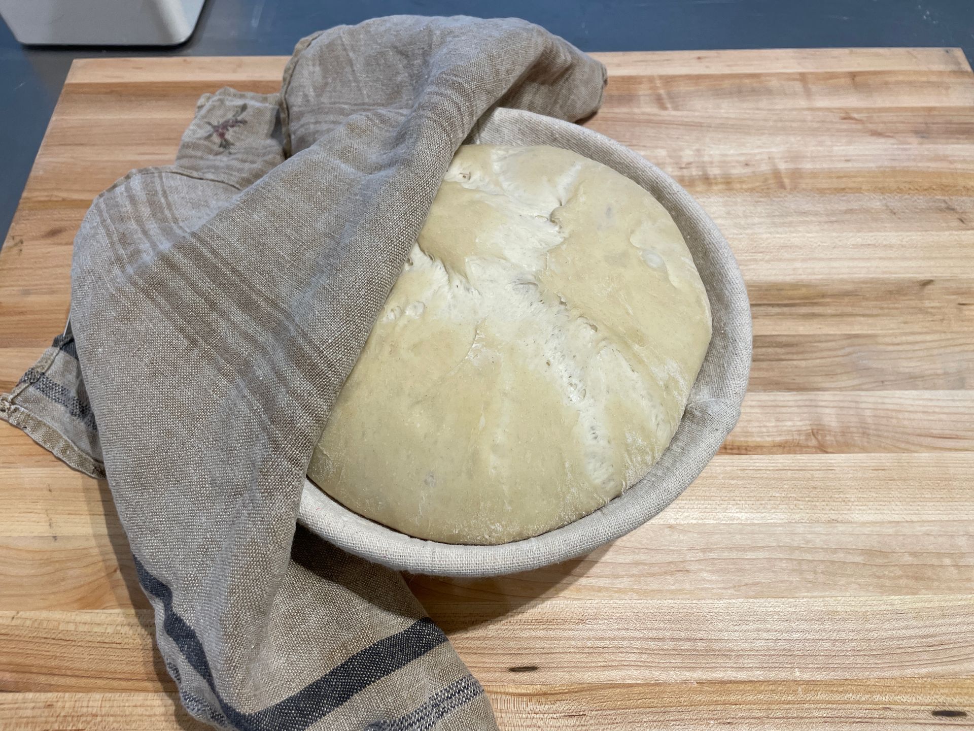 At 90 minutes, if properly proofed, the dough should be nice and puffy. If the dough is not quite ready, allow the dough to proof for another 30-60 minutes, as needed. When the dough is ready, roll the dough from the proofing basket onto a piece of parchment paper, folded side down.